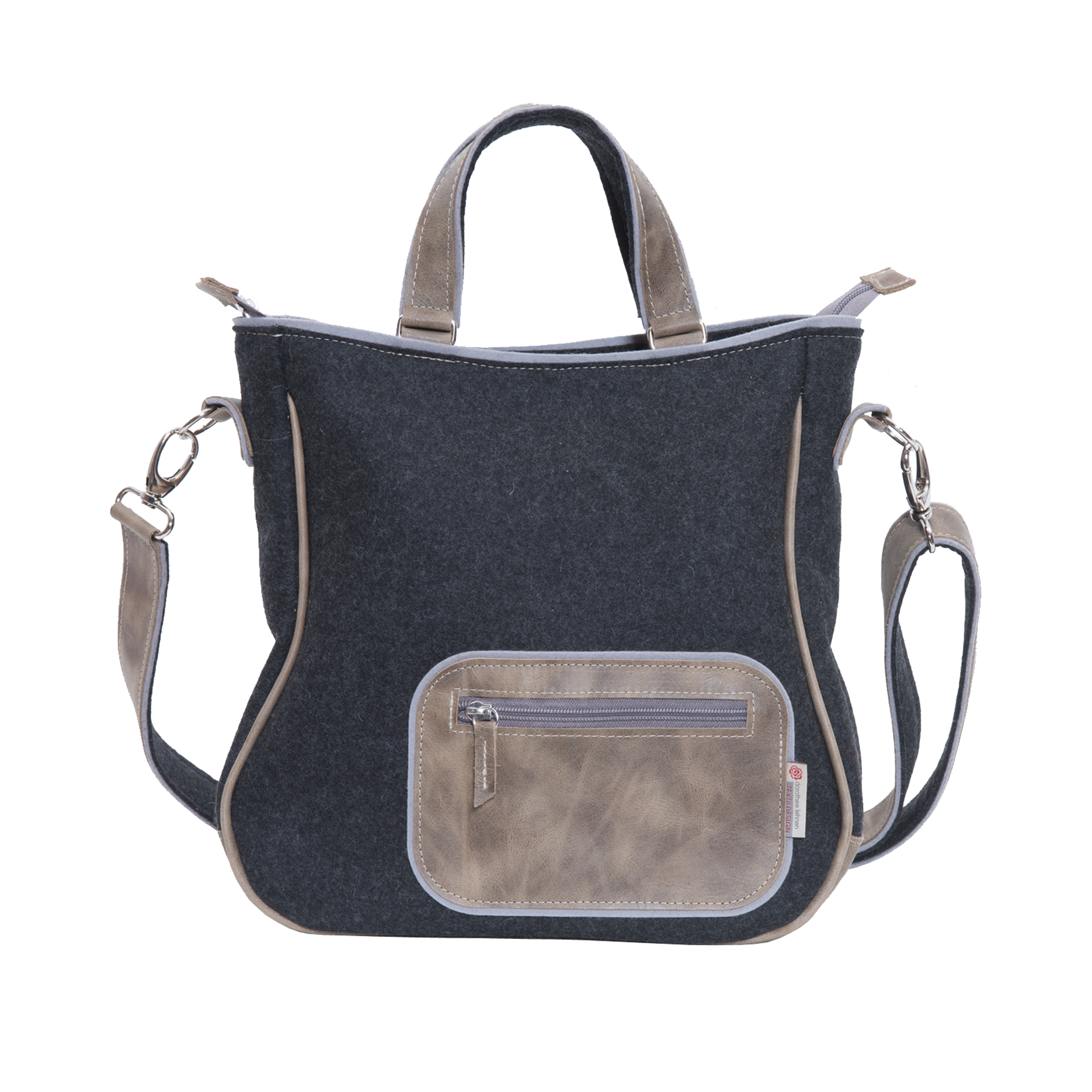 Eine Tasche für jede Gelegenheit und immer: Candy! Sie ist ein Leichtgewicht; aus reinem Wollfilz, echtem Leder und mit Futter aus Baumwollkaro gefertigt. Ihre Tulpenform ist feminin. Candy lässt sich überall hin tragen, quer, über der Schulter oder an den Griffen. Diese sind weich mit Filz gepolstert. Drei Fächer mit Reißverschlüssen, ein Schlüsselfinder, Fach für das Mobiltelefon und Lederboden unterstreichen ihr praktisches Wesen und gute Verarbeitung.